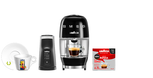The ultimate setup: A Modo Mio SMEG machine in Black , Milkeasy Plus frother, a free Cappuccino Set, and 5 free packs of capsules. Everything you need for café-quality cappuccinos at home..
